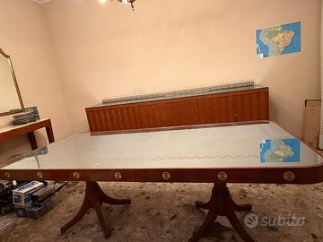 “Tavolo da pranzo in legno con piano in vetro, stile classico. Struttura solida con doppia base centrale. In buone condizioni generali. Ideale per soggiorno o sala da pranzo. Prezzo trattabile.”