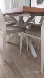 Il tavolo è impiallacciato di colore rovere cuoio ed ha uno spessore di 3,8 cm e le gambe sono in metallo bianco.