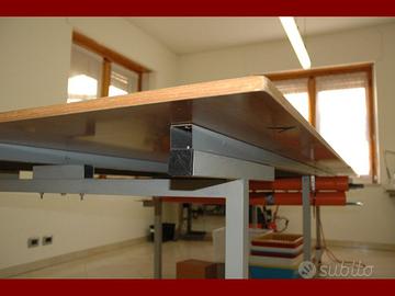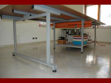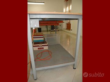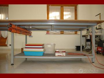 Tavolo da taglio o da lavoro, per laboratori artigianali, di sartoria. Realizzato artigianalmente con struttura in metallo verniciata grigio, assemblato con viti e due piani in legno laminato superiori da 150 x 180 cm e quello inferiore in truciolato. 2 tubi per riporre righelli e barre da taglio. Presa di corrente con prolunga per collegare attrezzi vari. Misure del tavolo: 150 x 360 x 92 cm. Altezza variabile di qualche centimetro con piedini in gomma a vite. Prezzo 500€. Ora è smontato, la parte non smontabile è di 90 x 110 x 190cm e ci sono due barre lunghe 230cm. Ci vogliono un paio di persone per portarlo fuori e caricarlo, perchè io ho la schiena malandata.