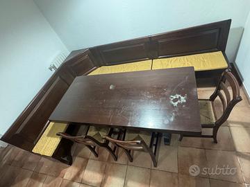 Panca ad angolo da taverna (misura lato corto 196 cm e lato lungo 278 cm tutto alto 95 cm) con sedute apribili contenitive, tavolo (misure 90 cm x 191 cm e alto 81 cm) e 3 sedie.