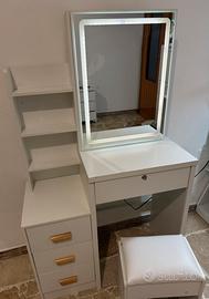 Il tavolo dispone di quattro cassetti capienti e un ripiano superiore, con molto spazio contenitivo per cosmetici e accessori.