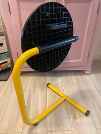 Presenta un telaio in tubolare di metallo verniciato giallo con una caratteristica forma a "C" che permette di avvicinarlo a divani o letti.