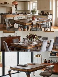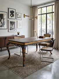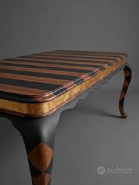 In vendita un pezzo d'arredo esclusivo, sintesi perfetta tra ebanisteria classica e design contemporaneo audace. Questo tavolo non è solo un mobile, ma una dichiarazione di stile realizzata con i legni più nobili della tradizione italiana. Costruzione e Materiali Pregiati: • Base e Struttura: Interamente realizzata in Noce solido, garanzia di robustezza e longevità. • Bordatura: Raffinata cornice perimetrale in Mogano, che dona una sfumatura calda e profonda al piano. • Dettaglio Luxury: Elegante fascia intarsiata in pregiata Radica, la cui venatura naturale crea un gioco di texture unico. Il Design: Il piano è stato reinterpretato con un motivo a fasce alternate (Legno e Nero/Grigio Antracite). Le gambe presentano un decoro artistico a losanghe (stile Harlequin) che esalta la struttura scultorea del mobile. Utilizzo Ideale: Un tavolo "statement" per una sala da pranzo di prestigio o come scrivania direzionale per un ufficio che vuole comunicare classe, solidità e creatività. Caratteristiche: • Stato: Eccellente, restaurato e decorato a mano. • Unicità: Impossibile da trovare in commercio, pezzo unico da collezione. • Dimensioni: 192 x 97 x 80 Prezzo impegnativo commisurato alla qualità dei legni e alla lavorazione artistica. Trattativa riservata. Ritiro a Milano, Monza e Brianza, Zona Laghi