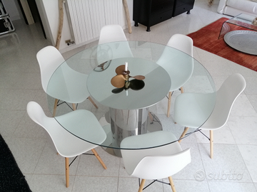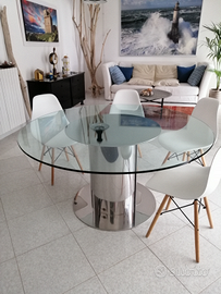 Tavolo originale anni 70 "Cidonio" di Astori, piano in cristallo trasparente da 145 cm di diametro,piede in acciaio alto 72 cm. Copertina di prestigiosa rivista di design.