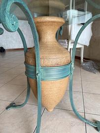 Vendo tavolo di design da pranzo di forma ovale in cristallo, con base di sostegno centrale in metallo e anfora.