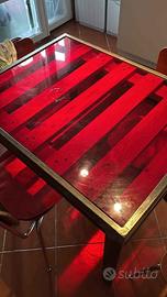 Tavolo unico, realizzato si ordinazione da giovane desiner, composto da struttura in ferro e pianale in pallet e plexiglass. Misure 124x85x80,5h comode 6 pax. A questo si aggiunge prolunga 64x85x48 o 80,5h, che rende il tavolo comodo per 8pax. La prolunga è anche utilizzabile anche come tavolino da fumo grazie a gambe accorciabili