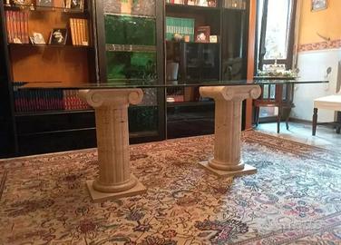 vendo splendido tavolo in cristallo molato misure lunghezza 200 cm x 100 cm di larghezza e 75 cm di altezza sorretto da maestose colonne a pilastro e capitello ionico in marmo travertino bianco 35 x 36 x73.5 spessore del cristallo 1,5 cm.
