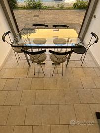 Tavolo per 6 persone con piano di cristallo e telaio completamente in ferro battuto. Dimensioni 81x140 cm e h76 cm