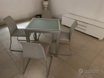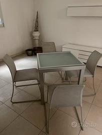 Tavolo da pranzo di cristallo opaco moderno, con gambe di metallo satinate + 4 sedie grigie in rivestimento tecnico dalla linea pulita con seduta comoda.