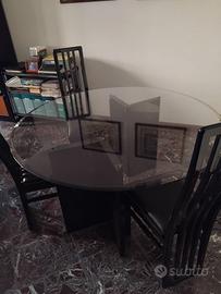 Tavolo di cristallo con supporto laccato nero e quattro sedie stilizzate laccate nere. Dimensioni tavolo: diametro c. 140