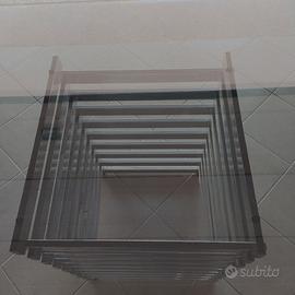 dimensioni piano in vetro cm 117 x 120. Presenta una piccola scheggiatura su un lato e non sull'intero spessore del vetro.