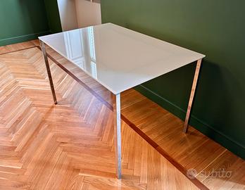 Tavolo con struttura in acciaio cromato e piano in cristallo accidato. Il brand è Bonaldo. Facilmente e completamente smontabile. Misure L120 P80 H75