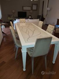 tavolo da pranzo elegante in legno laccato con piano in vetro cm.2400 × 90. poltroncine in pelle con schienale in velluto. ottimo stato.