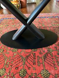 In vendita, in ottime condizioni, tavolo di design di forma ovale in vetro nero, con basamento a X in legno e base di metallo. Dimensioni del piano in vetro: lunghezza 180 cm, larghezza 90 cm. Altezza del tavolo: 76 cm.