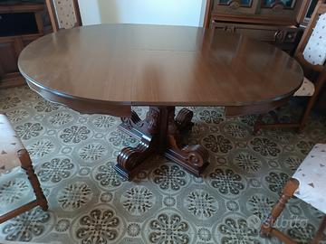 Tavolo legno massello intarsiato nel piedistallo. Rotondo e allungabile, piccolo difetto superficiale nella parte allungabile Dimensioni diametro 120cm allungabile a 160, altezza 80cm.