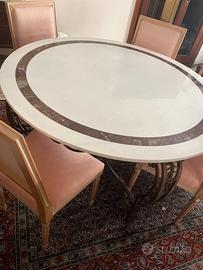 Vendo tavolo in marmo bianco di 130 cm di diametro rifinito con una fascia decorativa marrone. Le gambe sono in ferro lavorato a mano,con mazzo di fiorellinidi dimensioni discrete ed eleganti che aggiungono un tocco di raffinatezza.