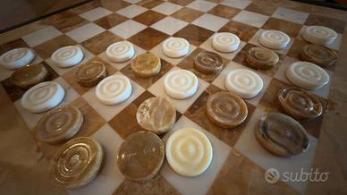 50 per 50 . Tavolo di marmo a scacchiera con 26 pedine di marmo per giocare a dama . Mai usato come nuovo.