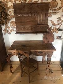 tavolo di servizio con mensola verticale intagliata porta utensili, mestoli carta spezie. inclusi sedia antica impagliata e tagliere in ginepro.