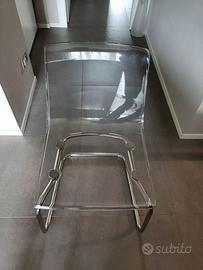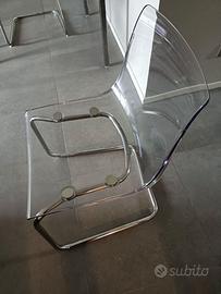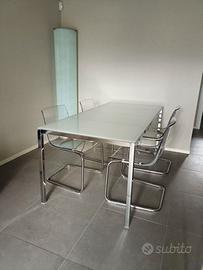 Tavolo in acciaio cromato e vetro temprato con 4 sedie di design in acciaio e seduta in policarbonato trasparente. Misure tavolo: lunghezza 180, larghezza 85 Cifra richiesta per tutto: 390 Euro