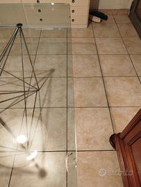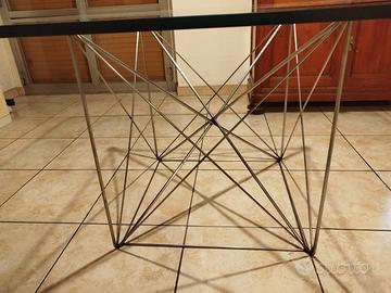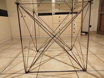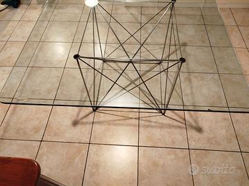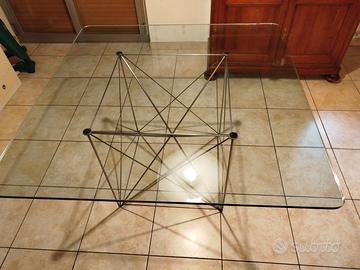 Tavolo quadrato stile modernariato in cristallo dello spessore di 1,5 cm su struttura in metallo. Misure 130X130, altezza 71 cm. Presenta due ammaccature sullo stesso lato, una più piccola ed una un po' più grande.