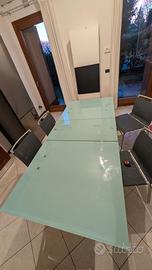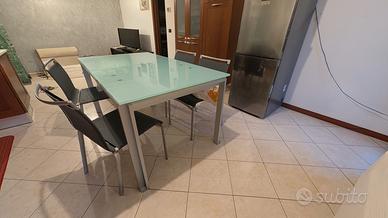 vendo tavolo di vetro temperato allungabile, marca BONTEMPI casa + 4 sedie , misure: -chiuso: 160cm lunghezza per 90cm di larghezza -aperto: 210cm lunghezza per 90cm di larghezza Non spedisco, smontaggio e trasporto a carico dell' acquirente. Disponibile a farlo visionare dal vivo prima dell' acquisto. Prezzo trattabile.