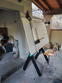 tavolo da disegno Heron P. originario, con tecnigrafo e righe trasparenti, lampada, sgabello, non più usato per cessazione attività.