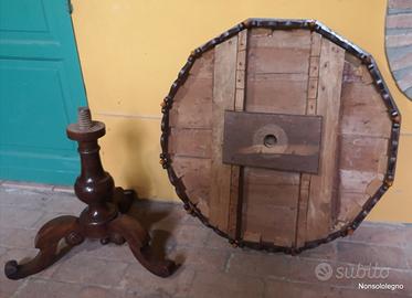 Un’ampia gola modanata separa il piano dalla base tornita; i tre sostegni raccordati lateralmente terminano con eleganti riccioli e omboni in rilievo che conferiscono movimento all’insieme.
