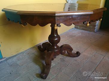 Museale e prezioso tavolo dodecagonale intarsiato di area Rolese, realizzato in noce massello con raffinate tarsie di legni vari e risalente alla prima metà del XIX secolo, in pieno periodo Restaurazione.