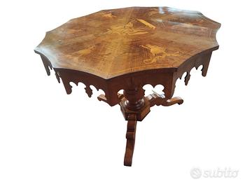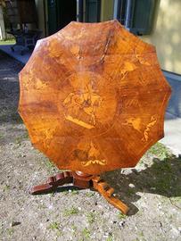 Museale e prezioso tavolo dodecagonale intarsiato di produzione Rolo, realizzato in noce massello con raffinate tarsie di legni vari, risalente alla prima metà del XIX secolo in pieno periodo Restaurazione.