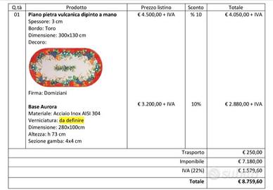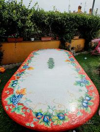 Vendo prestigioso tavolo ovale firmato Domiziani, leader mondiale nella lavorazione della pietra lavica. Un pezzo d'arte unico, interamente dipinto a mano da maestri artigiani. Dimensioni: 300 x 130 cm (ideale per 10-12 persone). Materiale: Piano in pietra lavica dell'Etna, ceramizzata e cotta a temperature elevatissime. Resistenza: Il tavolo è indistruttibile: resiste a gelo, sole, piogge acide e urti. I colori non sbiadiscono mai nel tempo. Design: Decoro classico con bordatura rossa e motivi di frutta e uva (collezione originale Domiziani). Base: Inclusa base acciaio inox coordinata, solida e resistente. Il tavolo si trova a Roma. A causa del peso importante della pietra lavica, il ritiro e il trasporto sono a totale carico dell'acquirente (necessario furgone e personale adeguato per il carico). Disponibile per visione solo se realmente interessati. Un investimento eterno per il vostro giardino o patio.