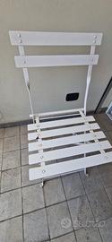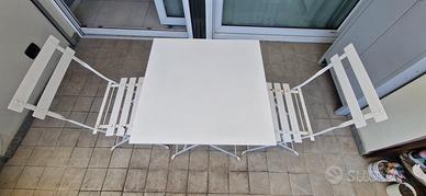 Tavolo e 2 sedie da esterno in metallo bianco, tutto pieghevole, tavolo 60x60cm ideale per verande, giardini o per il campeggio. Qualche piccolissimo punto con meno vernice come da foto, ma in ottime condizioni e usate poco.