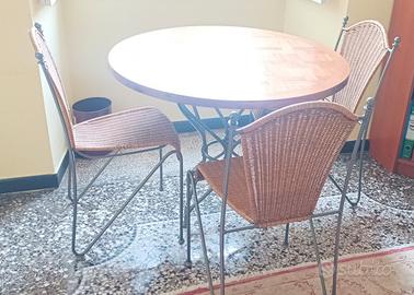 vendo tavolo struttura ghisa, piano vero legno, diametro 100 cm , h 75 cm , e tre sedie midollino e struttura ghisa. Eur 250 pagamento solo cash alla consegna disponibile con consegna al domicilio del venditore