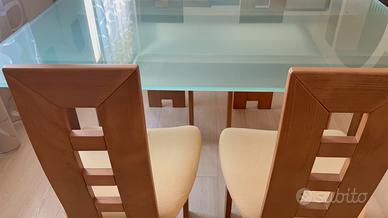 Tavolo 160x90 in noce e piano in cristallo. 4 sedie in noce e seduta imbottita. Prodotti artigianali, come nuovi !