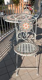 Tavolo e sedie in ferro, parte superiore mosaico. Diametro tavolo 70 cm circa. Tipo Ikea o Kasanova. Nella foto ci sono due sedie, le altre due (tutte uguali ) sono in garage. Ritirabile a Crema.