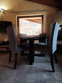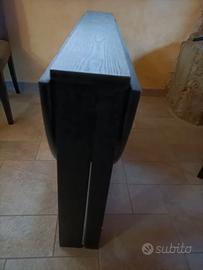 Tavolo in legno Nero, richiudibile e 4 sedie con copertura tessuto grigio e gambe nere tutto Ikea, tavolo aperto 115x100 , chiuso L 20 cm, sedie con schienale alto H 85 P 48. non trattabile.
