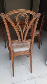 Bellissimo e raffinato tavolo 90x90 estensibile a libro, di pregio, realizzato in stile liberty. 4 sedie con dettagli floreali intagliati. Tappezzeria in stile. buone condizioni. qualche segno del tempo. Da eseguire trattamento per tarli, qualcuno presente sulle sedie e sulle gambe del tavolo, nessuno sul piano del tavolo. contatto wzzp per altre eventuali foto.