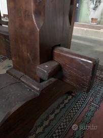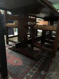 Vendo tavolo e 4 sedie in legno massello, arte povera. Il tavolo ha necessità di un piccolo restauro per dei segni dati dal tempo e in più gli manca un blocchettino di legno che tiene il tavolo fermo(particolare in foto)! Misure215x72 è alto 75. Vero affare