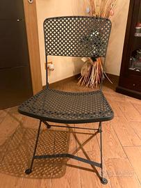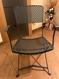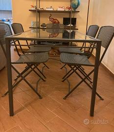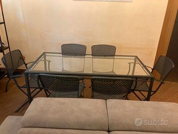 Splendido tavolo artigianale in stile contemporaneo con ripiano in vetro temperato cm. 180 x 80 e sei sedie, anche queste artigianali in ferro battuto, di cui due con braccioli, tutte richiudibili