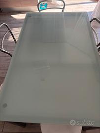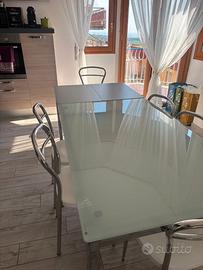 Senza spedizione, ritiro a carico dell'acquirente zona Roma e castelli Romani. Tavolo con ripiano in vetro temperato bianco e gambe in acciaio cromato.in ottimo stato senza alcun graffio. Misura 130x80 chiuso 180x80 aperto Con 6 sedie in legno bianche con gambe in acciaio presentano sulla seduta qualche graffio da normale utilizzo quotidiano.