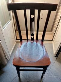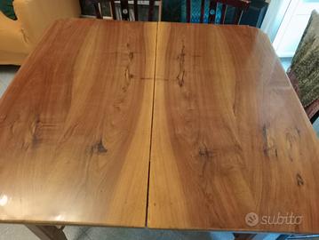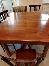 Vendo per problemi di spazio un tavolo in noce allungabile ma mancante di prolunghe le misure da chiuso sono 110x117 aperto sarà sui 220 cm necessita di qualche intervento di restauro .Le sedie ,sono artigianali non hanno marchio ma sono molto belle anche esse in legno massello e seduta intarsiata tipica del tempo e necessitano di restauro . In passato è stato fatto trattamento anti tarlo quindi al momento non sono presenti segni di infestazione.Ritiro e smontaggio a carico dell'acquirente.