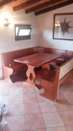 Realizzato artigianalmente da un falegname, in legno di pino. Le cassapanche sono formate da tre pz ed un angolare. Le panche sono tutte apribili con ampio vano portaoggetti sotto la seduta.