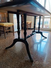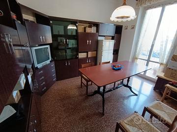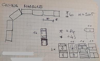 Tavolo robusto con stelo in asse centrale in legno e piano antigraffio color mogano. Mobile composto da 7 moduli di varia configurazione separabili e componibili a piacere. Superficie in laminato color mogano. Ante verticali a pannello o vetro, ante orizzontali a leva, cassettiera o vani a giorno. Misure elementi modulari: larghezza 84 (43 in uno mezza larghezza) x 40 cm, H 205 (uno solo passante in alto sopra frigorifero). Gratuito con ritiro a carico acquirente. Sedie e lampadario disponibili. Volendo anche il frigo.