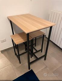 Bellissimo set composto da tavolo alto da pranzo con due sgabelli ideale per la casa (anche per piccoli ambienti), come per gli spazi esterni al coperto.