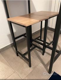 Tavolo e sgabelli sono realizzati con una solida struttura in acciaio in un elegantissimo colore nero e piano in legno truciolare colore naturale, che crea un bellissimo contrasto con il colore nero della struttura.