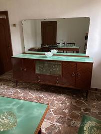 Offriamo gratuitamente, insieme al tavolo o separatamente, mobile per sala da pranzo con vetrina, in legno, marmo verde e specchio. Dimensioni larghezza 185 cm, profondità 44 cm, altezza 87 cm + specchio 84 cm.
