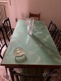 Tavolo da pranzo artigianale in legno con piano in marmo verde, dimensioni 153 cm x 79 cm, altezza 85 cm, al prezzo di 250 €.