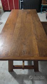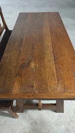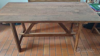 Tavolo e panca artigianali in legno massiccio, ricavati dal portone di una antica chiesa. Misure tavolo: 152 x 65 x 78 h Panca: 148 x 40 La superficie del legno presenta i segni di vecchie tarlature poi trattate.