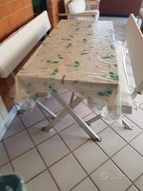 tavolo con panche in legno colore naturale, estremamente resistente e con struttura in ferro massiccio, coperture fatte su misura color panna misure del tavolo 1,40X 0,70 cm