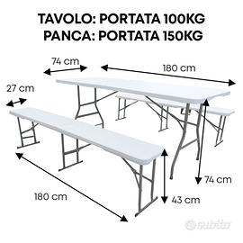 ✔️Trasportabile e Pieghevole: Set XXL 6/8 Posti cosi composto 1 tavolo e 2 Panche Sia il tavolo che le panche sono pieghevoli e facilmente trasportabili ma nello stesso tempo è un set robusto comodo e resistente grazie alla struttura in acciaio il tavolo Misura da aperto 180 x 75 x 74 Cm da chiuso 93 x 74 x 7.6 Cm Le panche da aperte Misura 180 x 27 x 43 Cm da chiuse 93 x 27 x 7.6 Cm