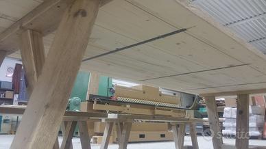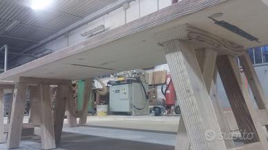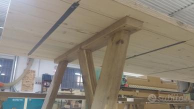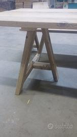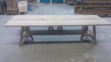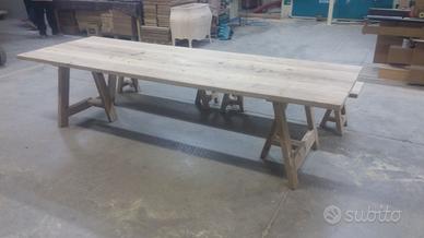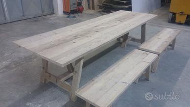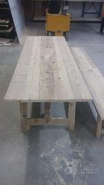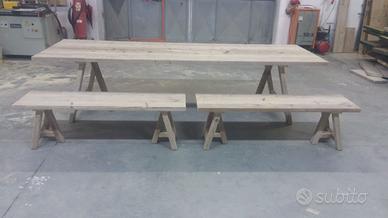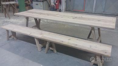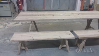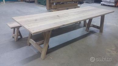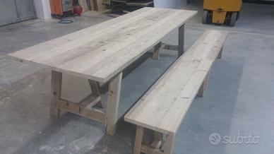 Tavolo costruito con legno di abete vecchio recuperato con misura lunghezza 300 larghezza 100 altezza 75 con 2 cavalletti con 3 gambe inclinate con traverso centrale per tenere il tutto saldo unito. Lo spessore della coperta e di circa 4 cm come pure i cavalletti, mantenendo la pattina naturale a vista. Sotto al piano verranno fatte delle fresate per inserimento dei ferri a T in modo da mantenere il tutto fermo e unito nel tempo. Unione con cola vinilica (certificata). Il tutto carteggiato e levigato in modo da pulirlo dalle impurità mantenendo la pattina originale. Completo di 2 panca con misura lungh. 150 larghezza 40 altezza circa 45 cm, anch'essa costruita con assi recuperate con 3 cavalletti con 2 gambe completo sempre con ferri sottostanti come il piano del tavolo. Il tutto con finitura effetto grezzo naturale trasparente impermeabile neutra che non alteri il colore. sotto ai cavalletti sono inseriti tappi in gomma in modo da non rovinare parquett, il tavolo è già stata costruito su commissione ed esigenze del cliente, non è disponibile a magazzino ma essendo i diretti produttori falegnami possiamo riprodurlo uguale o in base alle proprie esigenze. per domande o dubbi contattateci P.S. disponibili a dare suggerimenti o chiarimenti in merito, per noi conta dare vita al vostro sogno DIRETTAMENTE DAL PRODUTTORE ASTENERSI RIVENDITORI O COMMERCIANTI